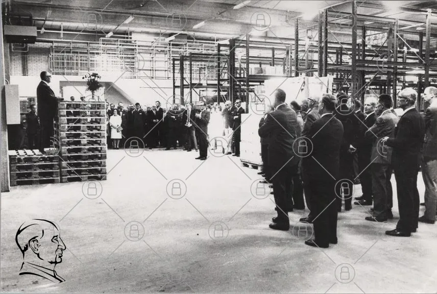 lager, människor, samling, tal, paletter, industri, evenemang, svartvit, förråd, företag, uppvisning, publik, blommor, kläder, byggnad, inomhus, 1960-tal, historia, arbetsplats, tradition