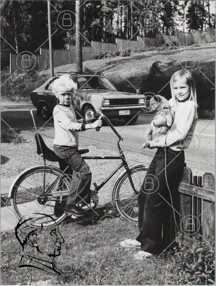 barn, cykel, hund, flicka, pojke, svartvitt, gata, bil, gräsmatta, träd, lek, sommar, 1970-tal, vintage, familj, utomhus, leende, kompisar, hus, cykeltur, sällskapsdjur, barndom, nostalgi, vänskap, natur, barnlek, fotografering, minnen, fritid, glädje