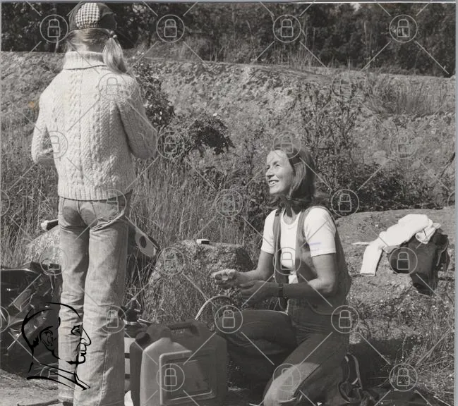 svartvitt, kvinnor, natur, kläder, 1970-tal, skratt, gasolkanna, jeans, tröja, stickad, bakifrån, leende, utomhus, sommar, fritid, landskap, rock, hår, långhårig, avslappnad, vänskap, aktivitet, fotografering, vintage, retro, stil, skog, sten, gräs, miljö