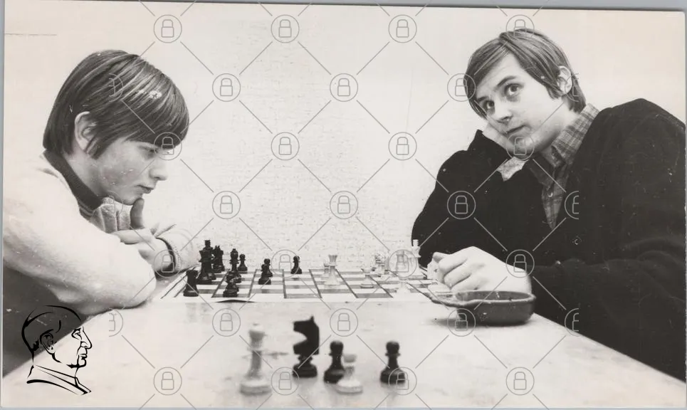 schack, spel, bräde, svart, vit, spelare, strategi, tävling, 1970-tal, koncentration, intellekt, två personer, bord, schackpjäser, ansiktsuttryck, fokus, klassisk, svartvitt, hobby, vänskap, utmaning, tänkande, analys, taktik, socialt, fritid, nöje, sport, mental, aktivitet