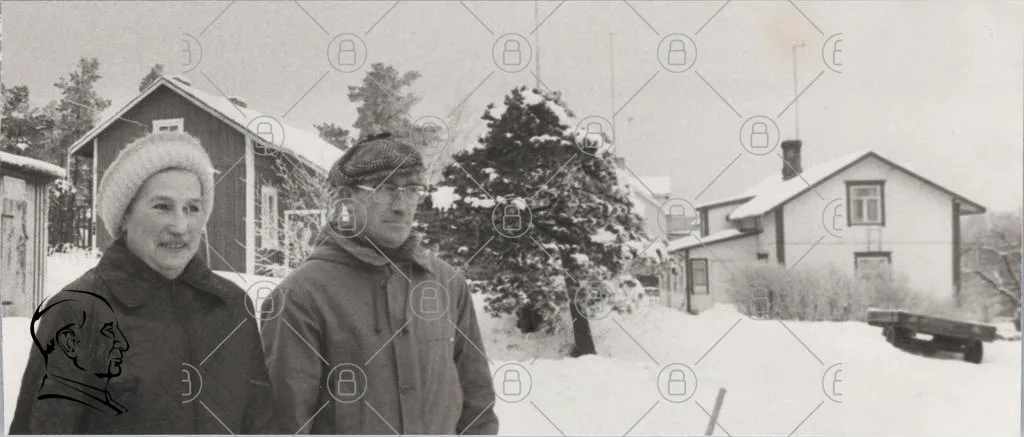 snö, vinter, man, glasögon, hatt, träd, byggnader, landskap, svartvitt, kallt, utomhus, kläder, natur, fotografering, gammal, traditionell, svensk, miljö, stillhet, ensamt, landsbygd, historia, person, snötäckt, väder, friluftsliv, retro, nostalgi, kultur