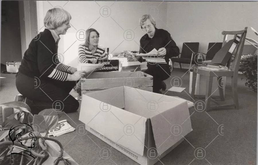 arbete, kontor, människor, pappersarbete, lådor, dokument, samarbete, 1970-tal, svartvitt, skrivbord, kontorsmiljö, arkivering, papper, organisation, möte, kvinnor, män, kläder, inredning, tidningar, kartong, arbetsuppgifter, fokus, diskussion, kontorsmaterial, kontorsstolar, arbetsplats, teamwork, projekt, planering