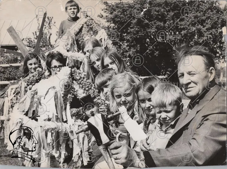 barn, fest, tradition, blommor, dekorationer, leenden, utomhus, samling, gammal, svartvit, figur, vuxen, glädje, sommar, kultur, hantverk, skulptur, gemenskap, firande, kreativitet, minnen, nostalgi, familj, skola, lek, konst, natur, träd, kläder, ansikten