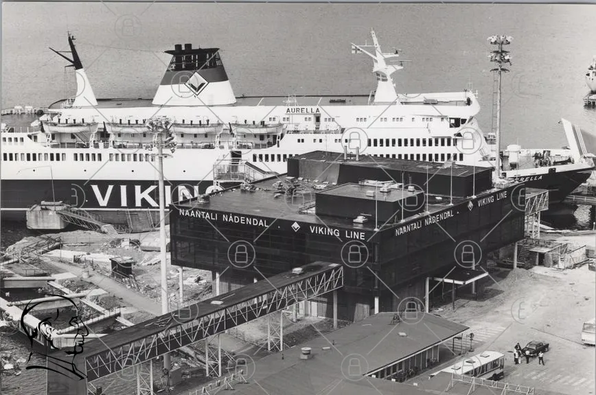 fartyg, Viking Line, Naantali, Aurrella, hamn, svartvit, byggnader, kaj, transport, sjöfart, passagerare, resor, Finland, Östersjön, terminal, last, båtar, sjö, rederi, turism, infrastruktur, hav, ankomst, avresa, färja, landskap, industri, logotyp, verksamhet