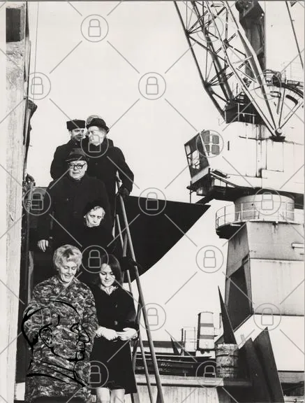 svartvit, människor, hamn, kran, industri, arbete, kvinnor, män, kläder, 1900-tal, gruppfoto, historisk, skepp, lastning, byggnad, tradition, samarbete, fotografi, porträtt, miljö