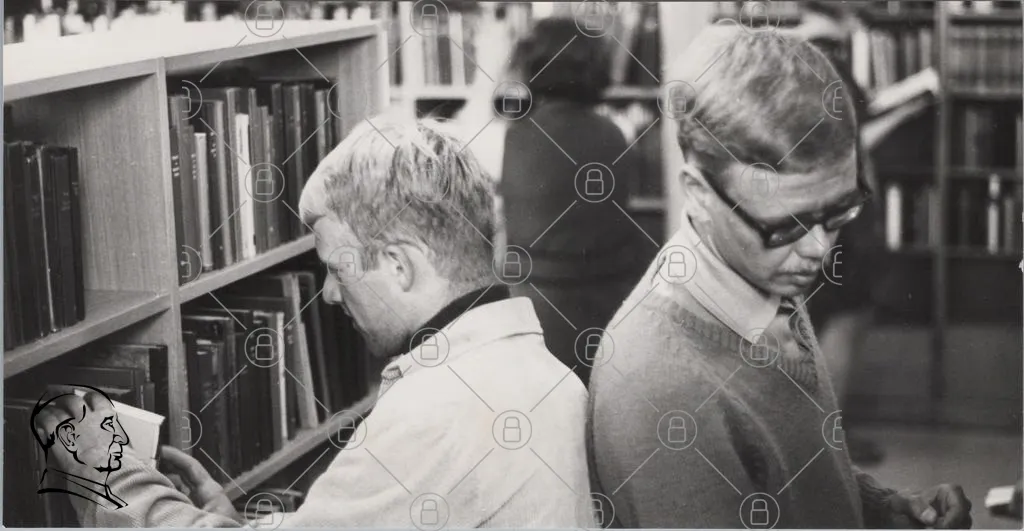 bibliotek, böcker, läsning, forskning, män, svartvitt, studenter, akademisk, kunskap, utbildning, hyllor, inomhus, koncentration, arbete, retro, 1970-tal, kultur, samhälle, intellektuell, miljö, samarbete