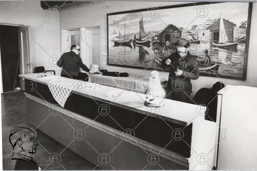 svartvitt, rum, bord, män, målning, båt, landskap, inredning, 1900-tal, kontor, kläder, lampor, dukar, vägg, konst, stolar, aktivitet, samarbete, tradition, kultur, historia, detaljer, interiör, arbete, miljö, stil, fotografi, retro, vintage, scen