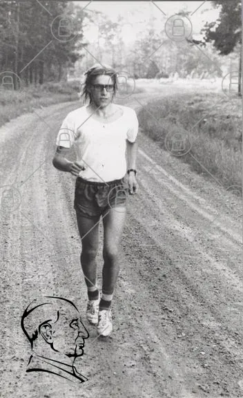 man, löpning, grusväg, sport, träning, vintage, svartvitt, shorts, t-shirt, glasögon, natur, motion, jogging, 1980-tal, utomhus, fitness, hälsa, aktiv, ensam, manlig, stil, retro, landskap, väg, svett, energi, fokus, uthållighet, joggingskor, fritid
