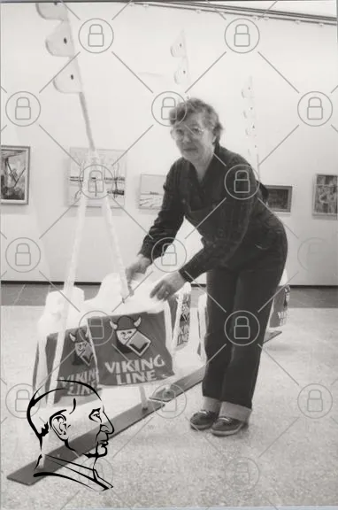 kvinna, Viking Line, påse, konstutställning, svartvitt, inomhus, 1980-tal, kläder, leende, konstverk, kultur, skandinavisk, fotografi, retro, tradition, resor, maritim, souvenir, handarbete, utställning, konstnär, besökare, interiör, konst, historia, nostalgi, design, identitet, samhälle, minnen