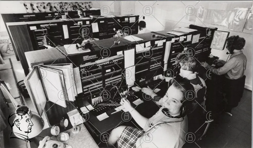 telefonist, telefonväxel, kontor, svartvitt, 1960-tal, kvinnor, headset, kommunikation, teknik, arbetsplats, vintage, manuell koppling, kontorsmiljö, telefonlinjer, utrustning, arbetsuppgifter, samarbete, professionell, historisk, retro