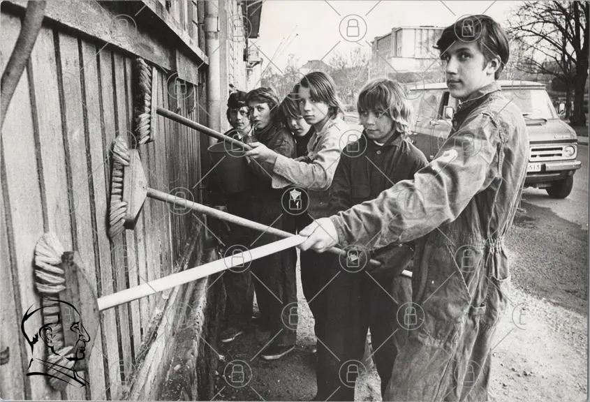 barn, arbete, byggnad, verktyg, trä, målning, svartvitt, ungdomar, samarbete, utomhus, historisk, aktivitet, hantverk, industri, gammal, pojkar, flickor, kläder, koncentration, gemenskap