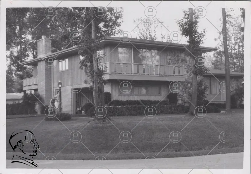 hus, byggnad, trädgård, gräsmatta, träd, balkong, fönster, lampor, väg, svartvit, bostad, arkitektur, landskap, utomhus, familj, stil, 1960-tal, modern, design, grönska, gård, entré, område, kvarter, bostadsområde, natur, hem, utseende, miljö, detaljer