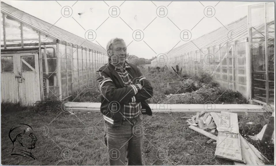 växthus, man, tröja, jeans, landskap, grönska, jordbruk, natur, svartvitt, odling, växter, gård, utomhus, stående, miljö, landsbygden, skörd, arbete, tradition, växtlighet, sommar, fritid, hobby, jord, växtodling, fotografering, person, manlig, ansikte, leende