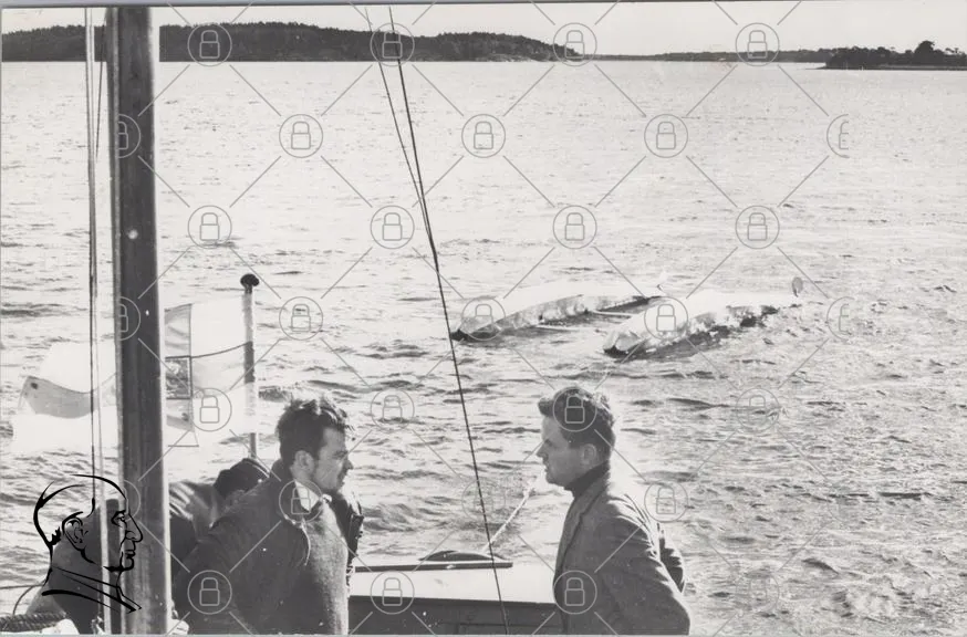 båt, män, hav, vatten, skärgård, svartvitt, segling, natur, landskap, sommar, fiske, vänner, utflykt, båtliv, vågor, himmel, kläder, 1900-tal, tradition, avkoppling, äventyr, fotografering, nostalgi, gemenskap, resande, båtfärd, sjö, kust, panorama