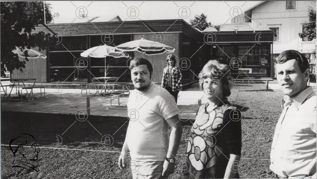 svartvit, människor, utomhus, byggnad, parasoll, 1970-tal, kläder, stil, trädgård, möbler, porträtt, man, kvinna, bakgrund, gräsmatta, sol, sommar, socialt, samvaro, retro, fotografi