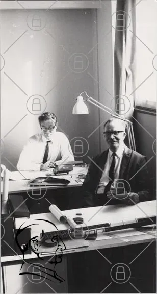 två män, kontor, skrivbord, lampor, papper, skrivmaskin, glasögon, kostymer, svartvitt, 1960-tal, arbete, dokument, kontorsmiljö, telefon, fönster, inredning, professionellt, samarbete, forskning, akademisk