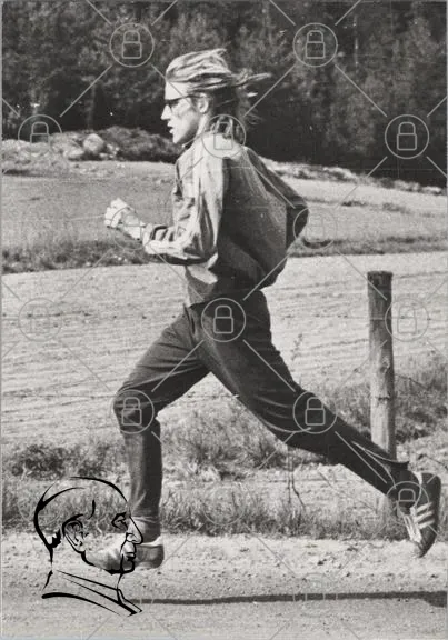 man, springa, svartvitt, kläder, natur, fält, trä, motion, 1970-tal, sport, solglasögon, hår, landskap, jogging, retro, stil, aktivitet, utomhus, manlig, hastighet, fotgängare, träning, jord, grönska, väg, fotboll, stil, vintage, kroppsspråk, energi, fokus