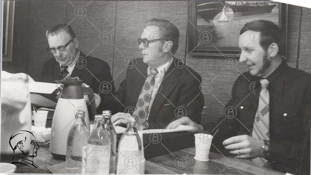 möte, män, kostymer, glasögon, bord, vattenflaskor, kaffekanna, svartvitt, diskussion, affärsmän, inomhus, 1960-tal, formell klädsel, konferens, samtal, dokument, anteckningar, professionell, samarbete, presentation