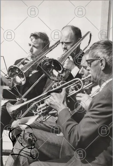 musiker, blåsare, trombon, trumpet, jazz, svartvitt, band, konsert, musik, 1960-tal, kostymer, instrument, uppträdande, ensemble, melodier, notblad, improvisation, underhållning, kultur, tradition