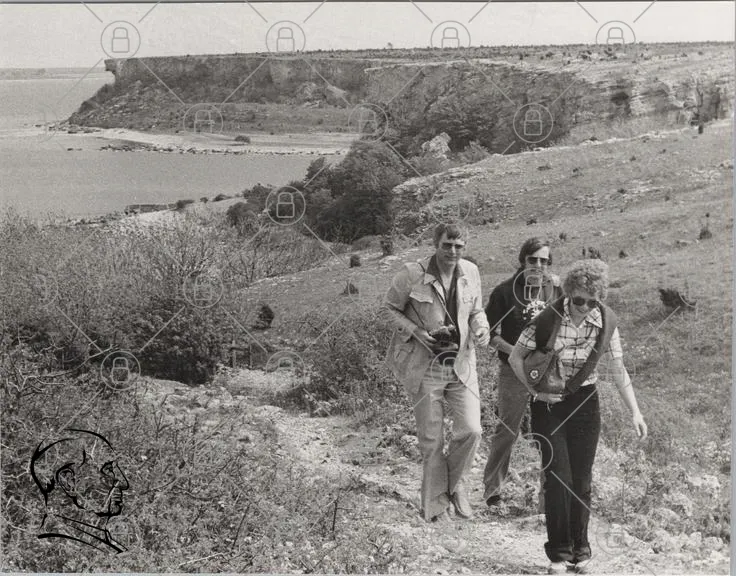 klippa, hav, natur, vandring, människor, fotografering, landskap, träd, buskar, stenig, svartvit, kust, semester, utflykt, kläder, kamera, stigar, grönska, fjärran, horisont