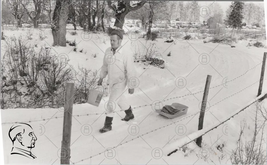 snö, vinter, man, kappa, korg, promenad, landskap, träd, staket, väg, fotspår, kallt, natur, svartvitt, traditionell, rural, friluftsliv, mjölk, kälke, avstånd, lugn, stillhet, ensamt, gammaldags, svensk, landsbygd, snötäckt, vinterkläder, hem, gård