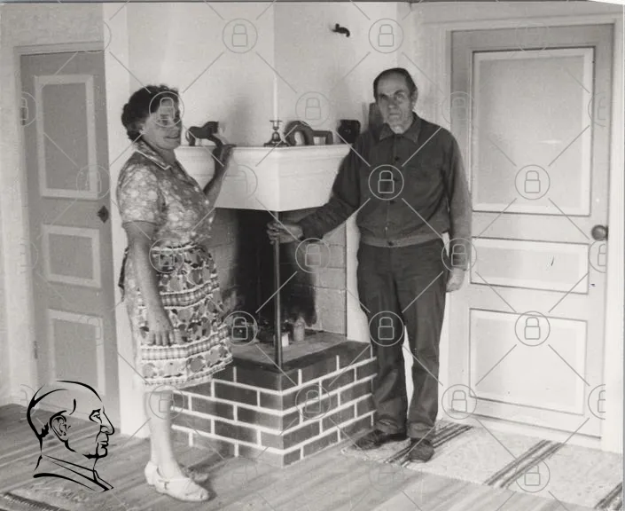 kvinna, man, inomhus, eldstad, svartvitt, vintage, möbler, hem, familj, tradition, 1900-tal, kläder, interiör, fotografi, gammal, par, stil, hemtrevligt, rum, väggar, golv, dekoration, ljus, historia, nostalgi, samvaro, kultur, hemmet, sällskap