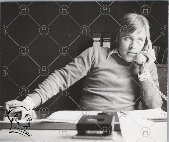 man, kontor, telefon, skrivbord, kläder, 1970-tal, svartvitt, ansiktsuttryck, arbete, dokument, pappersarbete, kontorsmiljö, koncentration, kommunikation, stil, retro, professionell, manlig, interaktion, kontorsutrustning, avslappnad, gest, fokus, samtal, arbetsliv, tidsepok, uttryck, kroppsspråk, arbetsplats, kontorsarbete
