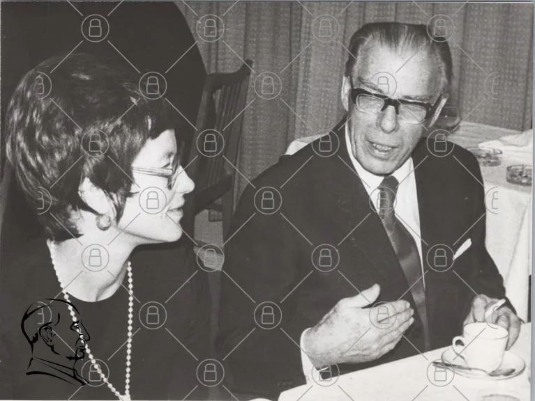 svartvit, porträtt, kvinna, man, samtal, kläder, 1960-tal, bord, inomhus, glasögon, smycken, leende, diskussion, vintage, socialt, uttryck, ansiktsuttryck, stil, elegant, interiör