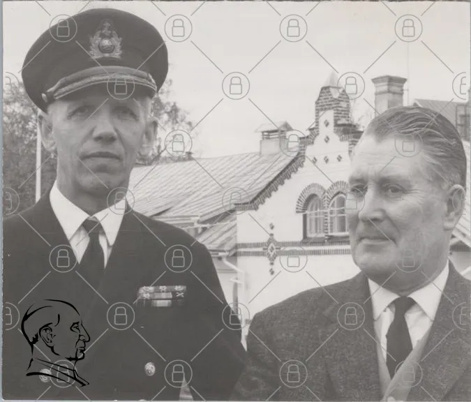 man, uniform, officer, military, portrait, historical, black and white, building, hat, medals, serious, two men, outdoors, vintage, 20th century, Sweden, architecture, facial expression, clothing, hairstyle, friendship, respect, leadership, ceremony, event, nostalgia, tradition, community, gathering, men