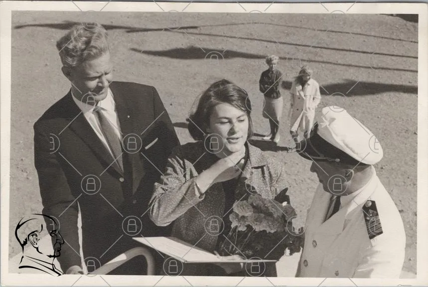 historisk, svartvit, kvinna, blommor, män, kläder, 1960-tal, möte, flygplats, hälsning, fotografering, offentlig, ceremoni, stil, ansiktsuttryck, grupp, bakgrund, tradition, kultur, evenemang, minne