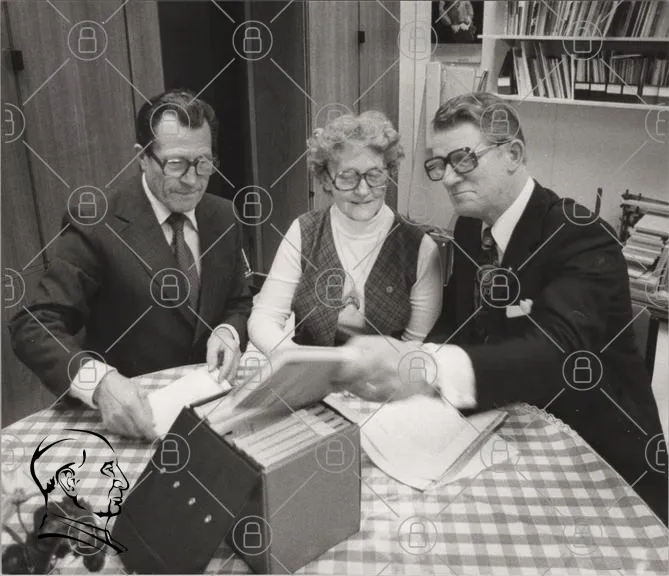 tre personer, bord, dokument, glasögon, svartvitt, äldre, kontor, samarbete, papper, mapp, kläder, diskussion, inomhus, skrivbord, böcker, rutigt, leende, arbetsmiljö, möte, historia