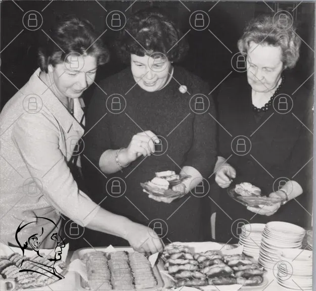 kvinnor, fest, bakverk, mat, servering, 1960-tal, svartvitt, sällskap, bord, kakor, smörgåsar, leenden, socialt, samvaro, tradition, snacks, plåt, tallrikar, kläder, stil, gemenskap, nöje, kultur, evenemang, hembakat, fika, samling, glädje, delande