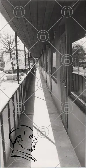 korridor, hotell, dörrar, fönster, träd, byggnader, svartvit, utomhus, gång, arkitektur, avstånd, belysning, tak, golv, räcke, landskap, stillhet, rum, passage, struktur, modern, design, miljö, perspektiv, linjer, skugga, natur, urban, tomt, lugn