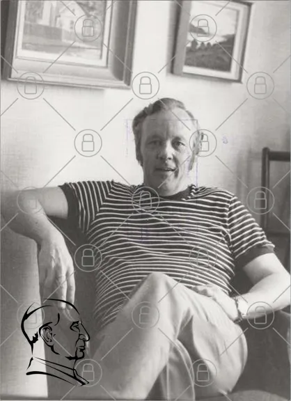 man, svartvitt, randig tröja, sittande, fåtölj, inomhus, porträtt, 1900-tal, avslappnad, leende, konst, fotografi, vintage, stil, personlig, uttryck, kläder, hår, arm, hand, möbler, vägg, tavlor, interiör, ansikte, kroppsspråk, tidsepok, nostalgi, kultur, historia