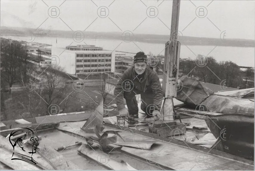 man, tak, byggarbetsplats, svartvitt, landskap, byggnad, träd, verktyg, arbete, utsikt, stad, konstruktion, kläder, säkerhet, höjd, fotografering, 1900-tal, industri, hantverk, arbete på tak, byggnadsarbetare