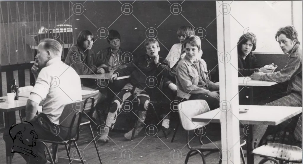 barn, pojkar, 1970-tal, svartvitt, inomhus, skola, bord, stolar, kläder, ungdomar, leenden, vänskap, grupp, fotografering, retro, nostalgi, lek, skratt, samvaro, gemenskap
