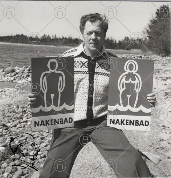 nakenbad, skyltar, man, kvinna, bad, natur, sjö, stenar, svartvitt, 1970-tal, simma, naken, friluftsliv, fotografering, svensk, kultur, badplats, symboler, reklam, tradition, utomhus, sommar, fritid, nöje, hälsa, kropp, konst, humor, samhälle