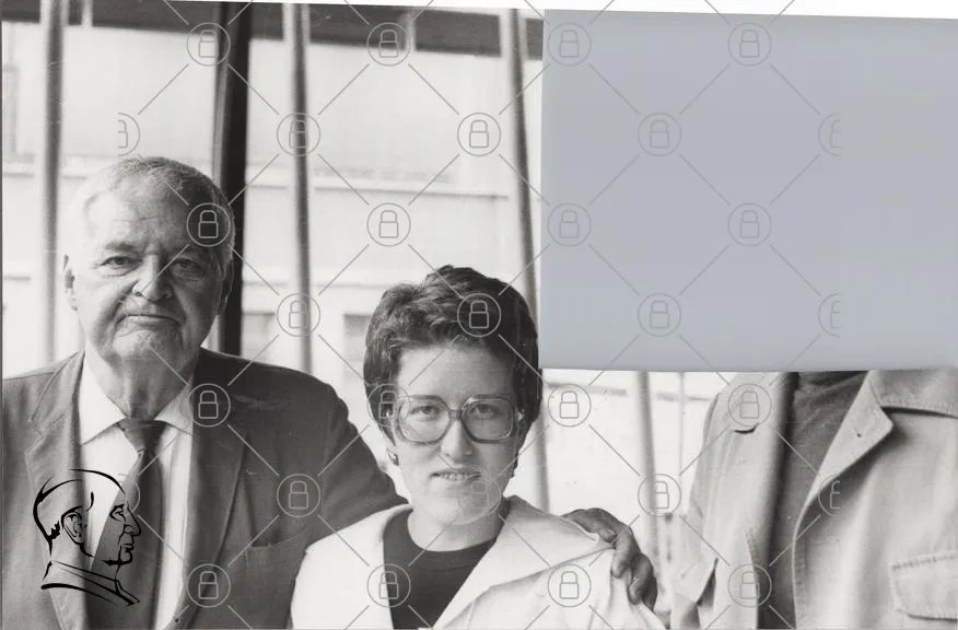 svartvit, foto, personer, glasögon, leende, kontor, kläder, man, kvinna, 1980-tal, professionell, gruppbild, inomhus, interaktion, ansikten, minnen, historia, socialt, samarbete, vänskap