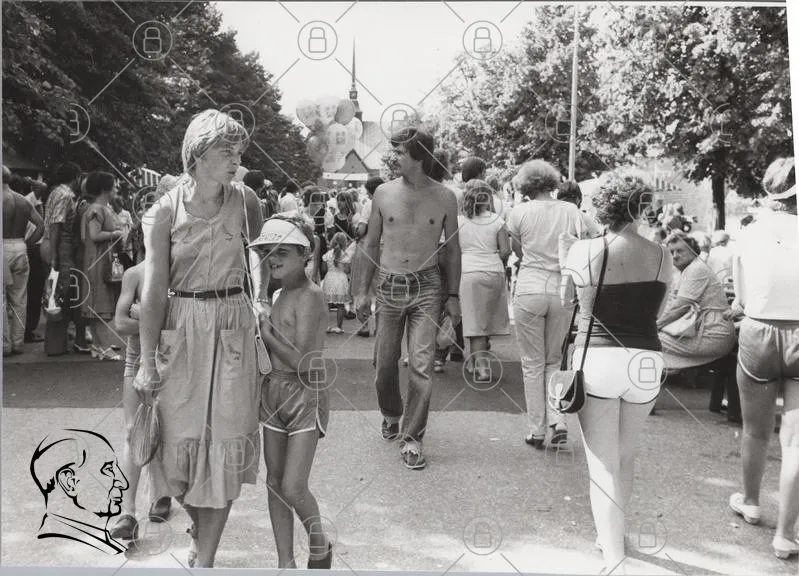 barn, kvinna, man, sommar, gata, folkmassa, kläder, park, träden, kyrka, svartvitt, familj, nöje, promenad, solhatt, shorts, vuxna, barnkläder, 1980-tal, festival, människor, stadsmiljö, leende, socialt, aktivitet, tradition, fritid, sommarsemester, gemenskap