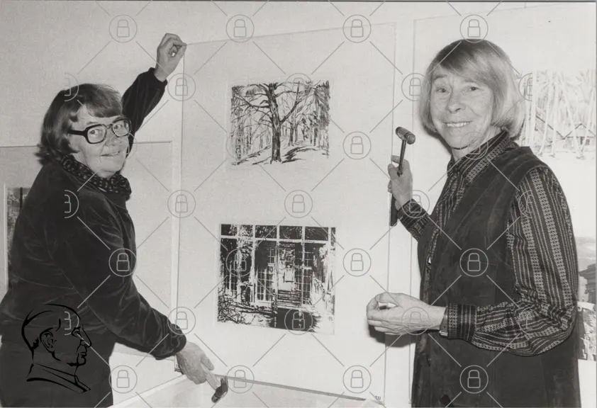 konstverk, träd, byggnad, svartvitt, utställning, konstnärer, hammare, glasögon, leende, tavlor, konstgalleri, presentation, konstnärlig, inramning, skiss, teckning, konstnärsduo, konstnärlig process, konstnärlig stil, konstnärlig teknik