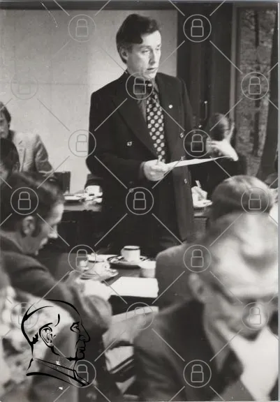 möte, konferens, talare, 1970-tal, svartvitt, affärsmän, diskussion, anteckningar, kaffe, kläder, kostym, bord, publik, presentation, ledarskap, professionell, inomhus, grupp, fokus, kommunikation, samarbete, idéer, information, debatt, uttryck, engagemang, uppmärksamhet, interaktion, samling, nätverkande