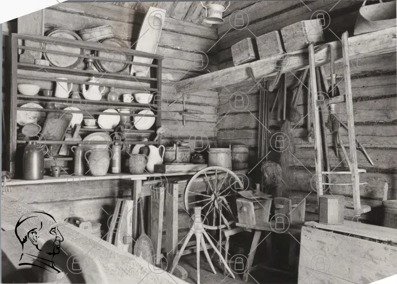 verktyg, hylla, keramik, krukor, snurrande hjul, trä, hantverk, gammal, inredning, rustik, föremål, hantverksmaterial, lådor, vävstol, skålar, korgar, vägg, rum, traditionell, antik, handgjord, samling, redskap, hantverkare, kultur, historia, föremål, design, textil, träarbete