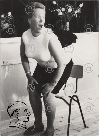 svartvit, kvinna, sport, träning, vintage, 1900-tal, gymnastik, kläder, rörelse, uttryck, inomhus, stol, aktivitet, hälsa, fitness, ängelholm, 1950-tal, nostalgi, kroppsspråk, leende