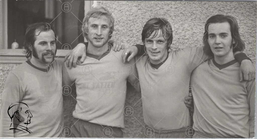 fotboll, spelare, lag, svartvitt, sport, träning, 1970-tal, män, leende, tröjor, gemenskap, idrott, utomhus, vänner, nostalgi, fotbollsträning, samarbete, laganda, minnen, historiskt