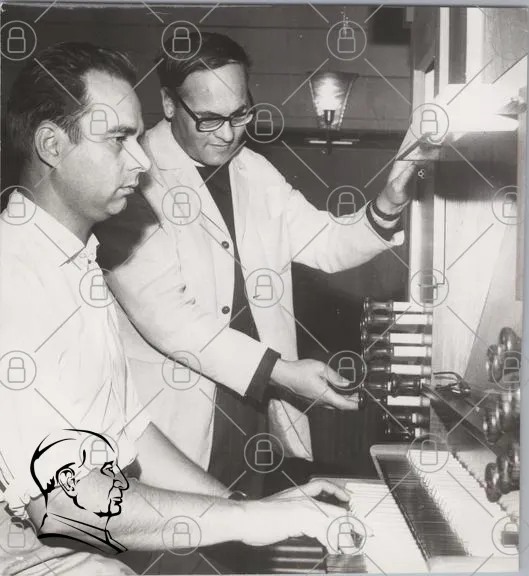 musiker, orgel, man, svartvitt, 1960-tal, instrument, teknik, musik, studio, komposition, ljud, kreativitet, samarbete, forskning, elektronik, vintage, foto, historisk, kultur, konst, ljudteknik