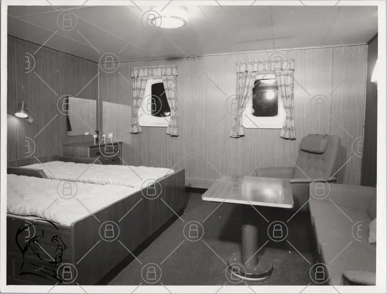 hytt, båt, inredning, fönster, säng, bord, stol, gardiner, spegel, golv, väggar, svartvit, marin, komfort, resande, rum, möbler, belysning, avkoppling, stil