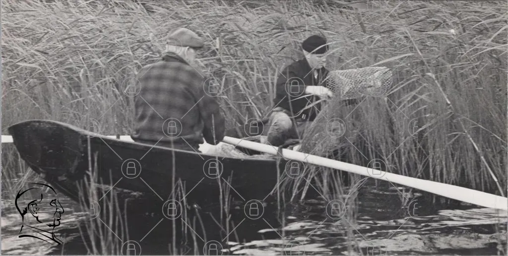 fiske, män, båt, vatten, nät, gräs, svartvitt, traditionellt, fiskeutrustning, natur, landskap, samarbete, hobby, utomhus, äldre, rekreation, stillhet, lugn, sjö, fiskeplats