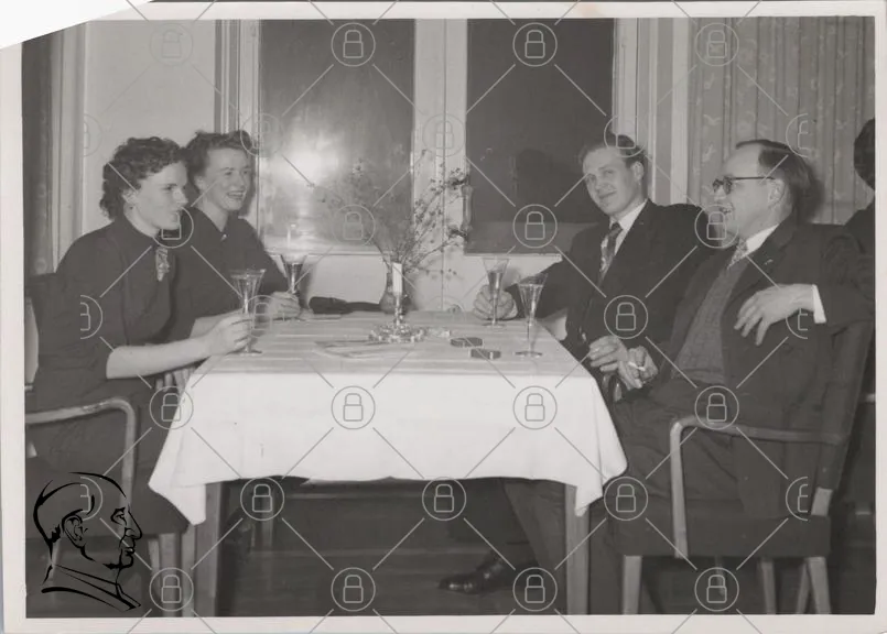 middag, sällskap, bord, glas, blommor, kläder, leenden, 1950-tal, svartvitt, fest, vänner, samtal, inomhus, möbler, dekoration, skratt, tradition, socialt, samvaro, familj, minnen, nostalgisk, interiör, gemenskap, festligheter, drycker, eleganta, stämning, tidsepok