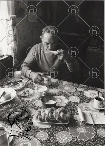man, kaffe, kopp, mat, bord, bakverk, mönstrad duk, fönster, svartvitt, frukost, skål, tallrik, bröd, anteckningsblock, penna, inomhus, stillhet, ätande, traditionell, hemtrevlig