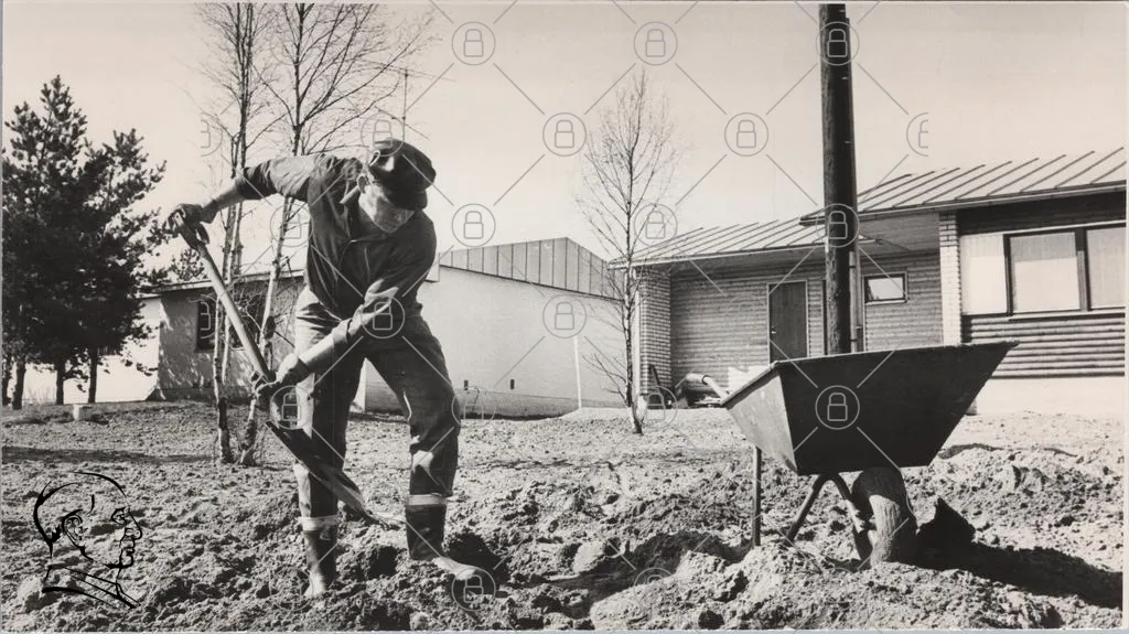 man, gräva, spade, trädgård, hus, byggnad, landskap, svartvitt, arbete, utomhus, vår, natur, jord, skottkärra, träd, mark, planterar, hantverk, traditionell, svensk, 1900-tal, jordbruk, anläggning, grönska, fritid, hobby